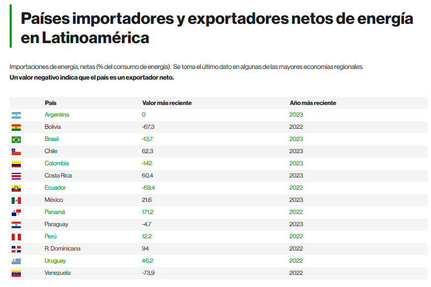Importaciones de energía, netas (% del consumo de energía).  Se toma el último dato en algunas de las mayores economías regionales. Un valor negativo indica que el país es un exportador neto.