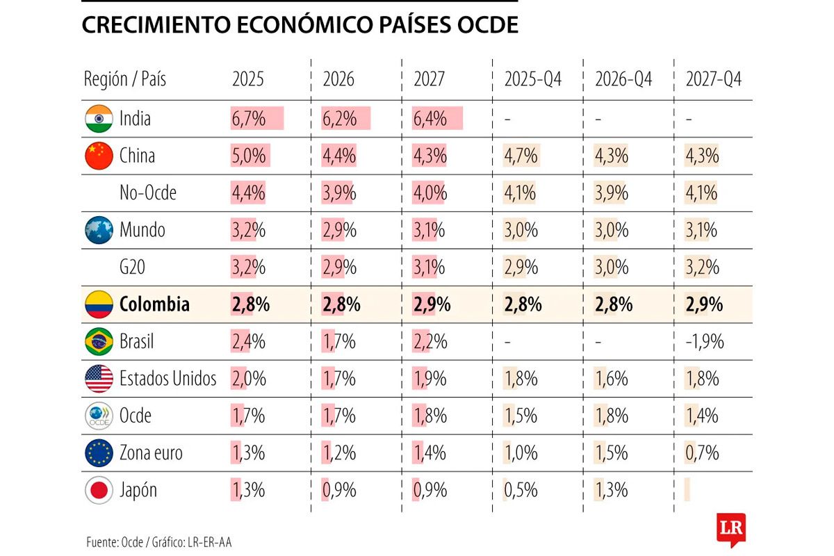 La economía colombiana crecería 2,8% en 2025 y 2026, y subiría a 2,9% en 2027, según la Ocde