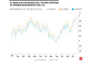 El rendimiento a 30 años superó alrededor de 4,96%, mientras que el de 10 años subió hasta cuatro puntos básicos hasta casi 4,73% Los rendimientos estadounidenses