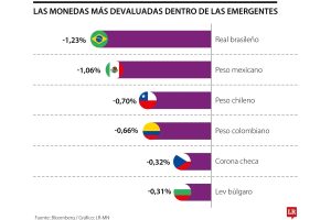 Al peso local lo anteceden el real brasileño como la que más cae con -1,23%; el peso mexicano con 0,70% y el peso chileno con -0,70%
