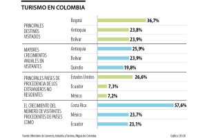 Los principales destinos más visitados por los extranjeros no residentes fueron: Bogotá (36,7%), Antioquia (23,8%) y Bolívar (21,0%) Las cifras del primer trimestre del año en