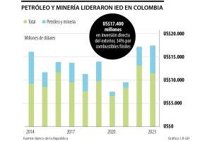 La inversión extranjera directa aumentó a US$17.400 millones, según el Banco de la República; el 34% fue por combustibles fósiles. Colombia registró un récord en flujos