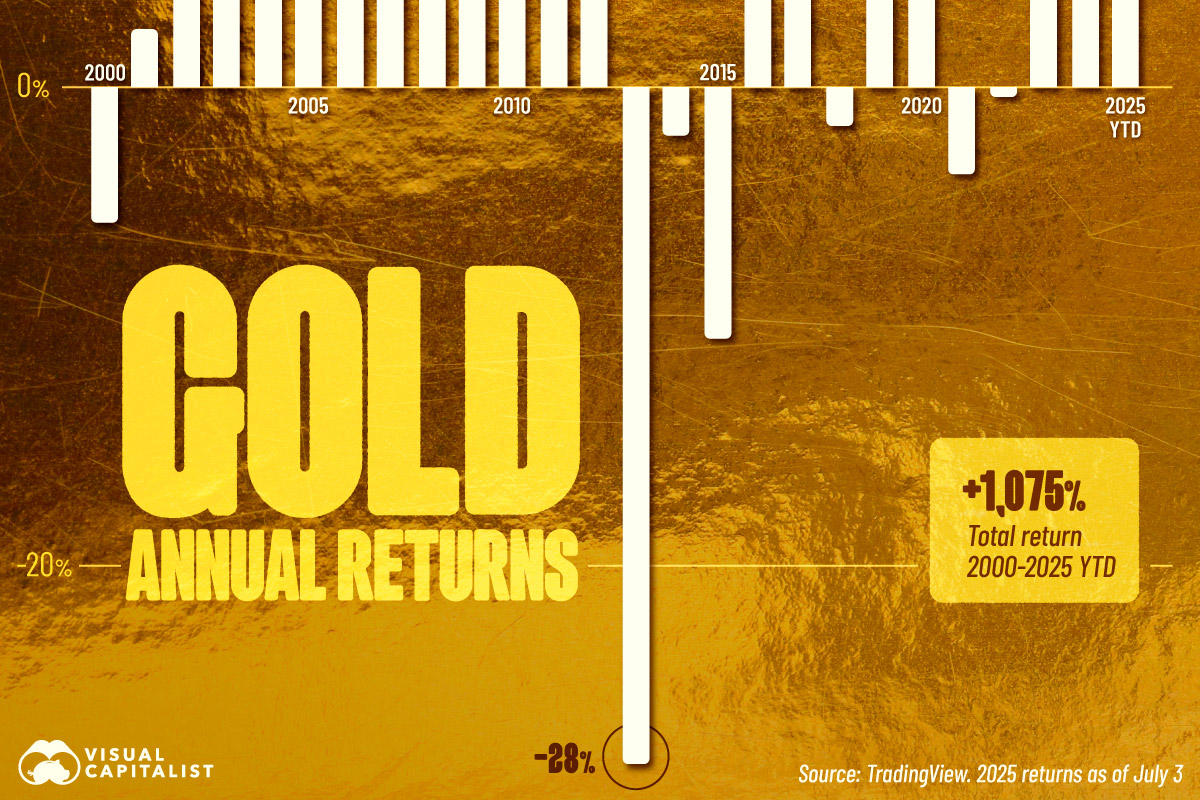 Visualized: Gold’s Annual Returns from 2000 to 2025 YTD
