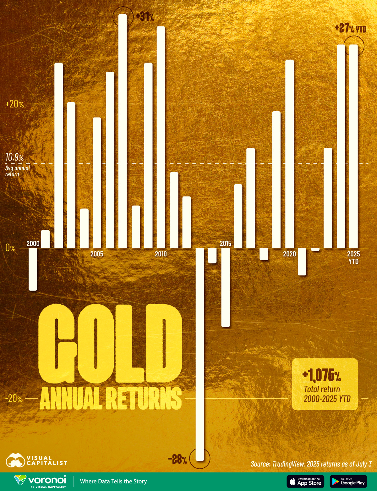 Información extraída de: https://www.visualcapitalist.com/charted-golds-annual-returns-2000-2025/