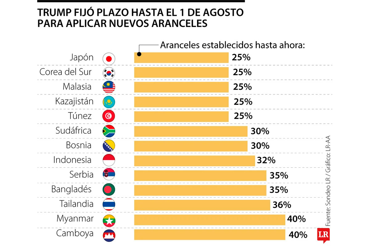 China, inicialmente señalada con aranceles superiores a 100%, tiene hasta el 12 de agosto para llegar a un acuerdo con la Casa Blanca para evitar que Trump restablezca restricciones adicionales a las importaciones impuestas durante los intercambios arancelarios de abril y mayo.