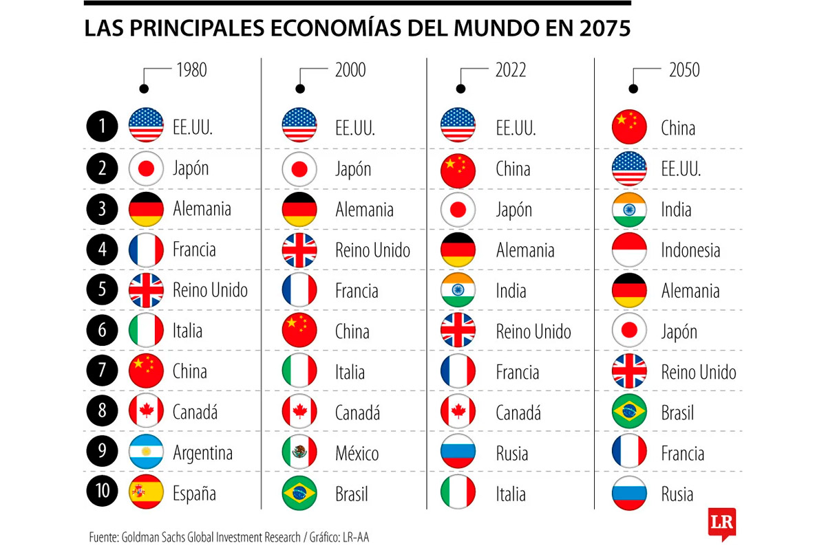 El orden de las principales economías del mundo ha cambiado de manera significativa durante los últimos años y, según las proyecciones, esta seguirá siendo la tendencia para los próximos 50 años. Un repaso desde finales de 2000 hasta las estimaciones de 2075, realizado por Goldman Sachs, muestra un cambio en la distribución del poder económico, con el desplazamiento de países desarrollados por naciones con poblaciones más numerosas, impulso en turismo y comercio.