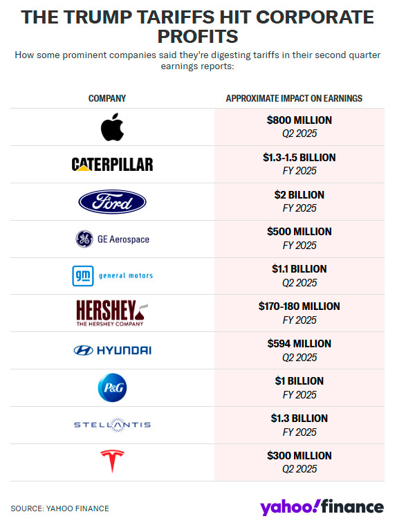 A Yahoo Finance analysis of earnings calls found that tariffs and other aspects of Trump’s trade war are harming profits and forcing price hikes in at least seven of the 11 sectors that comprise the S&P 500 stock index. Four sectors are relatively unscathed: Communication Services (XLC), Financials (XLF), Real Estate (XLRE), Utilities (XLU). Those sectors include 161 of the S&P 500 companies, and they generally involve services not subject to tariffs or are domestic in nature.