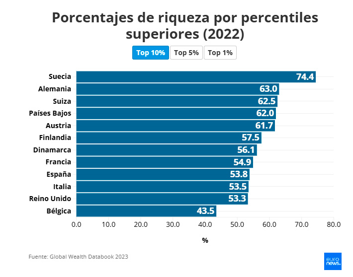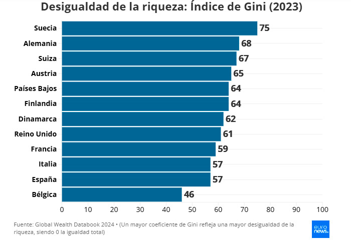 En 2022, el 10% de los hogares más ricos de Suecia poseía el 74,4% de la riqueza total, mientras que en Bélgica sólo el 43,5%. Estos dos países tenían las puntuaciones más altas y más bajas del Índice de Gini de desigualdad de la riqueza, respectivamente, entre los 12 países incluidos en 2023.