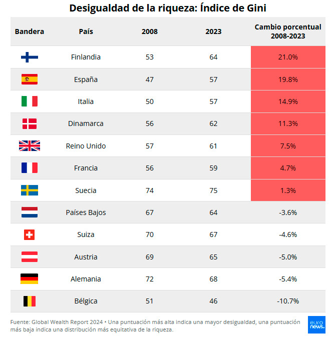 Si se observa la variación del Índice de Gini entre 2008 y 2023, Finlandia registró el mayor incremento, con un aumento del 21%, de 53 a 64. España le siguió de cerca, con un aumento del 20%. España le siguió de cerca, con un aumento del 20%, de 47 a 57.