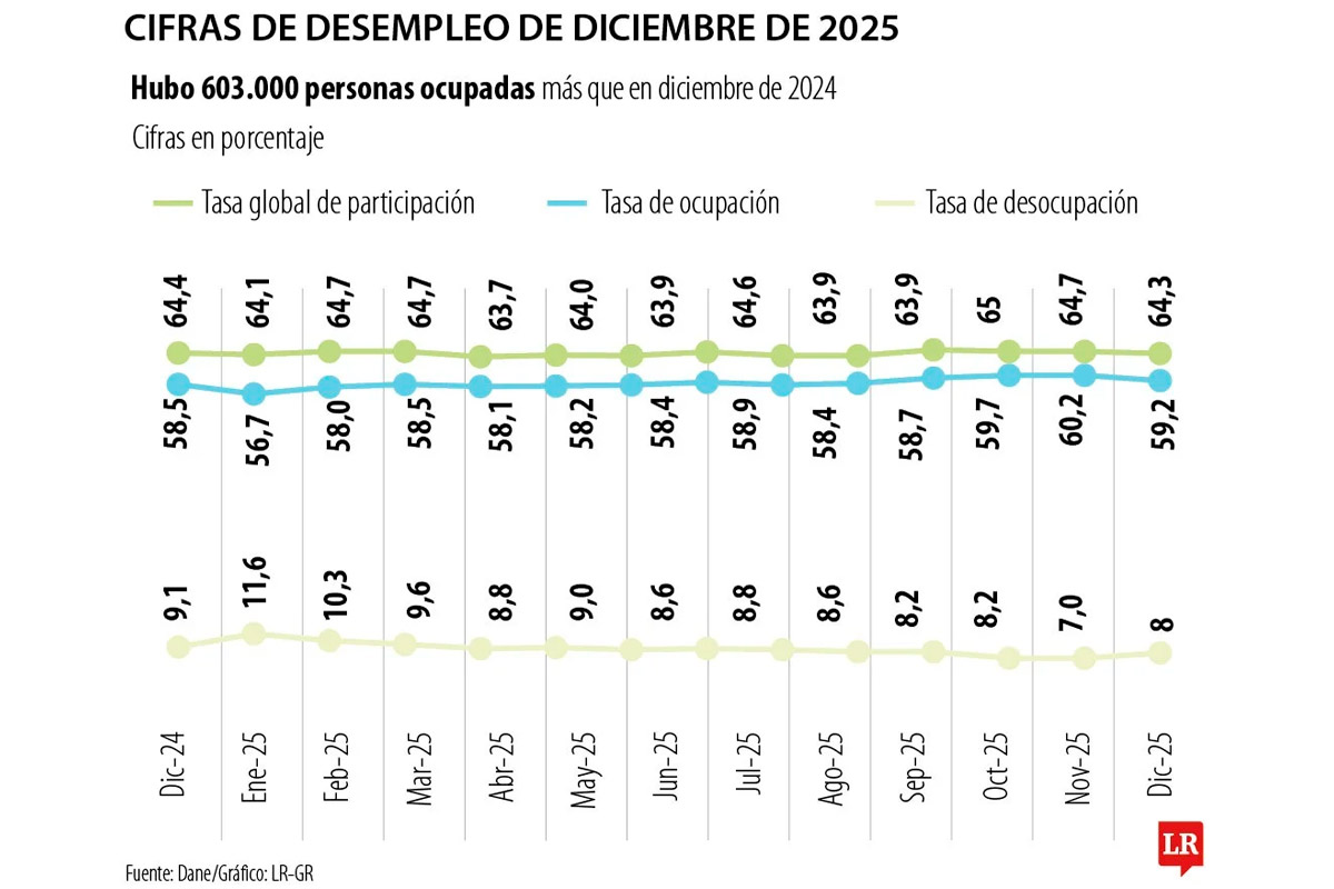 En el año enero – diciembre de 2025, la Tasa de Desocupación a nivel nacional fue de 8,9%. La Tasa Global de Participación fue de 64,3% y la Tasa de Ocupación fue de 58,6%. Piedad Urdinola, directora del Dane aseguró que para el mes de diciembre la población ocupada aumentó 603.000 personas en diciembre de 2025, lo que equivale a 2,6% más respecto al año anterior.