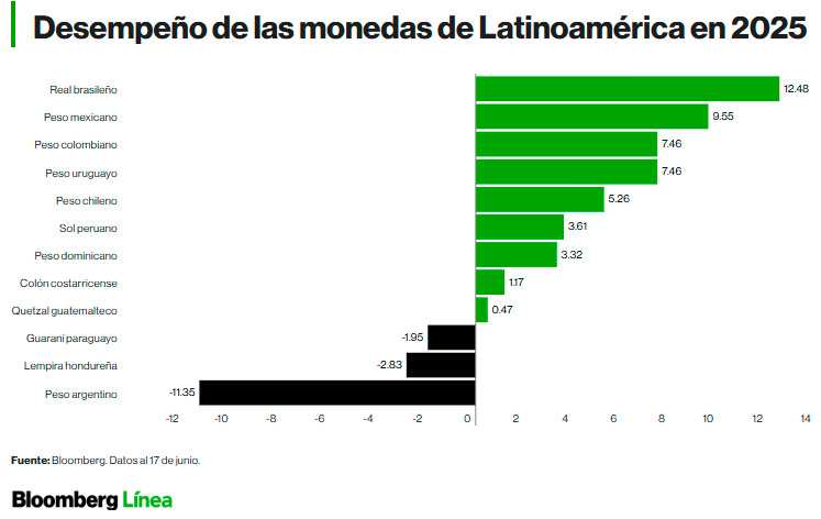 Las principales monedas de Latinoamérica van camino a cerrar un primer semestre en terreno positivo en medio de la debilidad global del dólar y el repunte de los precios del petróleo ante las tensiones en Medio Oriente, aunque con marcadas excepciones como es el caso del peso argentino que se ha depreciado un 18% en lo corrido del año.