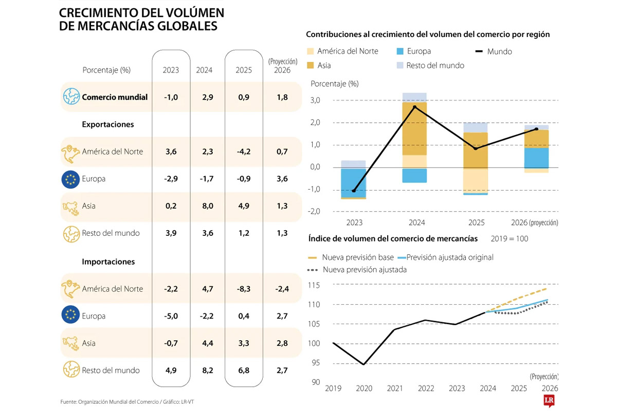 Actualmente, se espera que el crecimiento del comercio mundial de mercancías tenga una expansión más baja de lo previsto, ya que se proyecta que sea de 0,9% en 2025. Sin embargo, con el tiempo y el aumento de los aranceles acabará jugando una mala pasada; la tasa de crecimiento del volumen de comercio estimada para el próximo año pasó de 2,5% a 1,8%.