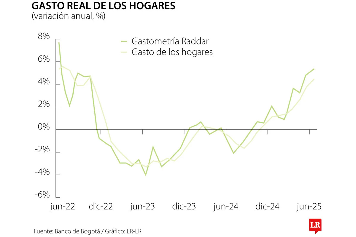 Mientras se publican los resultados del ISE, el grupo de investigaciones económicas de Banco de Bogotá resaltó el comportamiento que ha tenido la división de consumo interno, al menos en el último año. Las perspectivas dan cuenta que, frente a junio de 2024, el dato tuvo una mejoría de 7,3 puntos porcentuales, al pasar de -2% a 5,3% en 12 meses.
