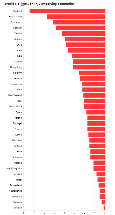 Las economías más expuestas se concentran en Asia. Tailandia soporta un déficit energético equivalente al 7,4% del PIB, el peor del índice, seguida por Corea del Sur, con un 5,7%, Singapur, Vietnam y Taiwán. Japón, India y Turquía no se quedan muy atrás.