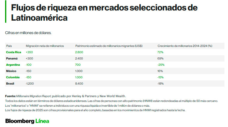 Costa Rica y Panamá se encuentran entre las economías latinoamericanas que más fortunas atrajeron a sus países en lo que va corrido del año, un fenómeno migratorio en el que cientos de millonarios de la región abandonaron o están dejando sus países de origen, según la consultora Henley & Partners.
