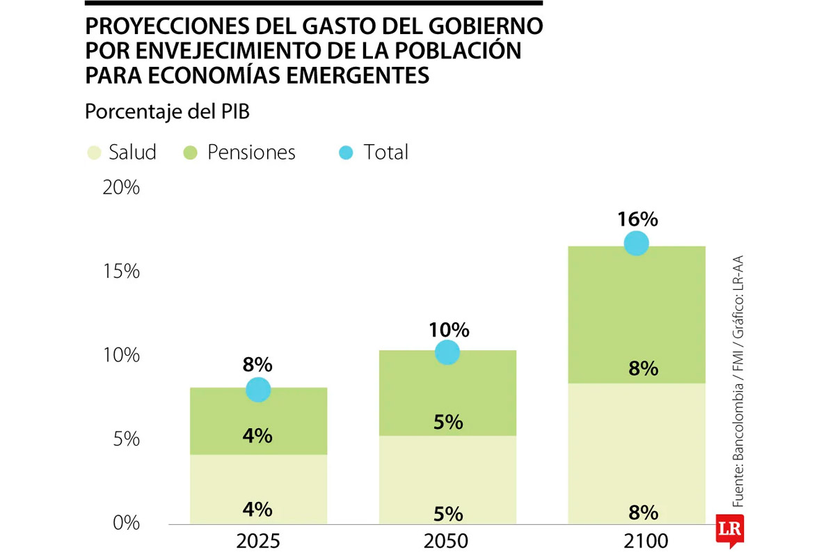 El envejecimiento de la población es un fenómeno que viene discutiéndose desde hace unos meses, y Colombia no es la excepción a un comportamiento que ocurre a escala mundial. El equipo de economistas de Bancolombia señaló que las proyecciones de gasto del Gobierno por el envejecimiento de la población en una economía emergente ascenderían, para 2100, a 16% del PIB, concentradas en rubros como la salud y pensiones. Para 2050, el gasto en salud y pensiones podría alcanzar 10% del PIB, y para 2025, ya representa alrededor de 8%.