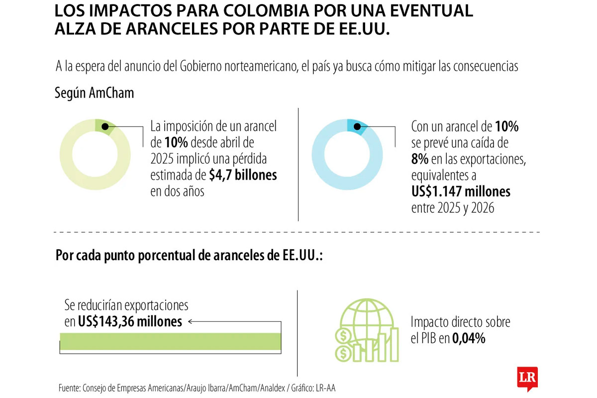 En un escenario hipotético en el que EE.UU. aumente 10% los aranceles a productos colombianos, se prevé una caída de 8% en las exportaciones totales, lo que equivaldría a una reducción de US$1.147 millones entre 2025 y 2026, según cifras de la Cámara de Comercio Colombo Americana, AmCham.