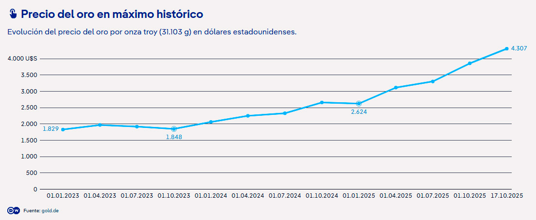 El oro alcanzó en octubre un récord histórico de más de 4.350 dólares por onza troy – medida estandarizada internacionalmente -. Desde entonces se estabilizó alrededor de 4.115 dólares (al 25 de noviembre).