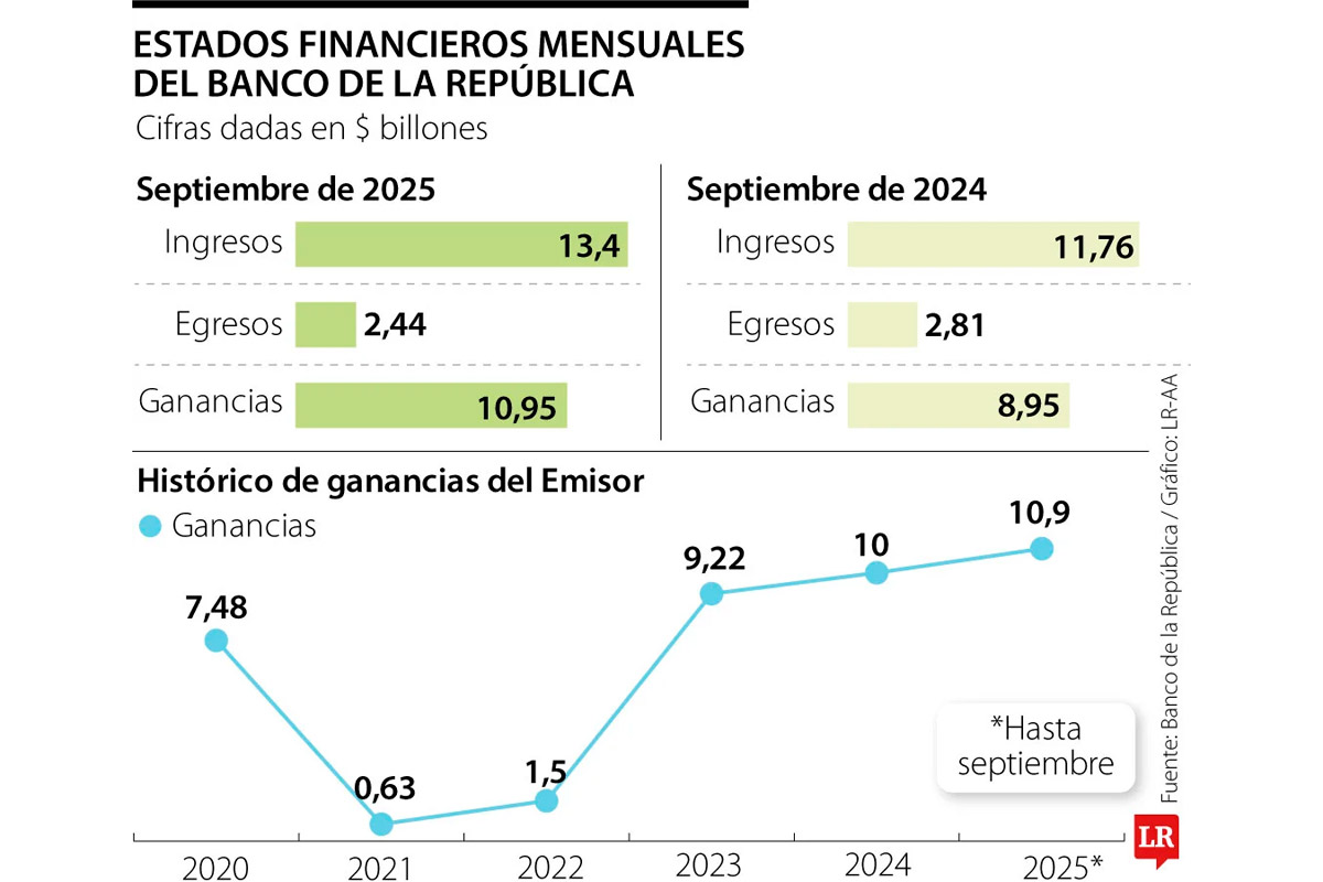 Las utilidades del noveno mes de 2025 ya superan las de todo 2024, cuando sumaron $10,04 billones. Los resultados del ejercicio demostraron ingresos totales por $13,4 billones y egresos por $2,44 billones.