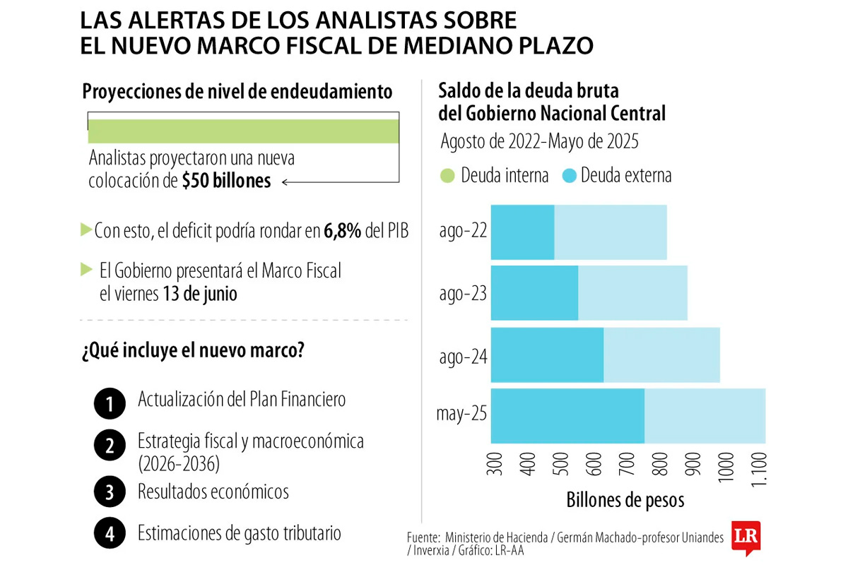 “La idea de realizar una nueva colocación de $50 billones, estaría en línea con las proyecciones de 7,1% para 2025 ajustado por recaudo. Sin embargo, considerando las tasas en las que se ubica la curva de crédito, la colocación a tasa fija podría realizarse a mediano plazo (5 años) a 11,7% efectivo anual, o a más de 10 años a tasas cercanas a 13%, con riesgo de aumentos en las tasas en función del momento de colocación y de cómo el mercado absorba las proyecciones del Marco Fiscal de Mediano Plazo”, dijo Alexander Ríos, economista y asesor financiero.