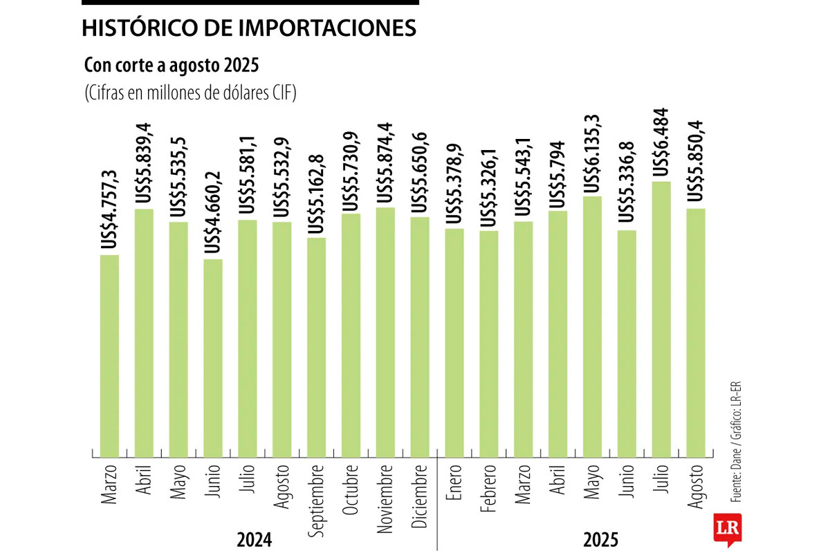 El Departamento Administrativo Nacional de Estadística, Dane, reveló el reporte mensual de importaciones, que hasta agosto representaron US$5.850,4 millones, lo que supone un aumento de 5% frente al mismo mes del año pasado.