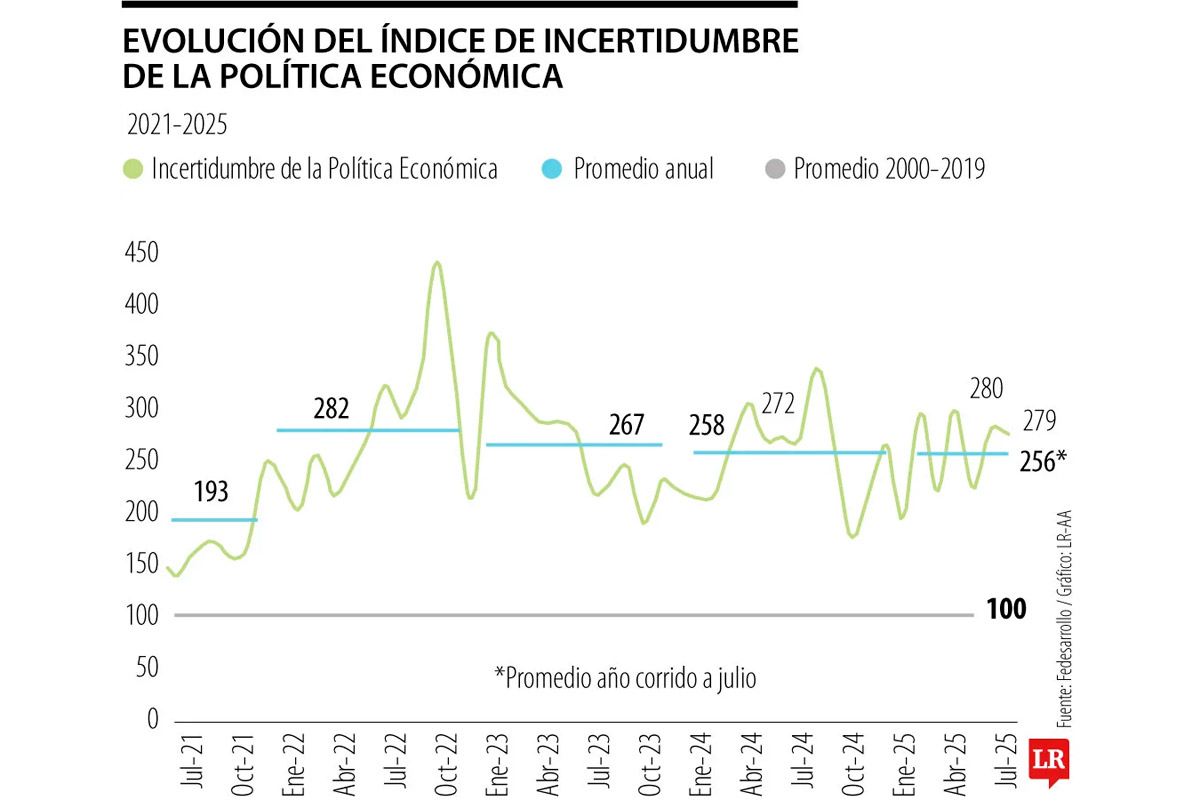 El Índice de Incertidumbre de la Política Económica, publicado por Fedesarrollo, se ubicó en 279 puntos para julio de 2025, lo que representó una leve reducción frente a junio de 2025, cuando alcanzó 280 puntos.