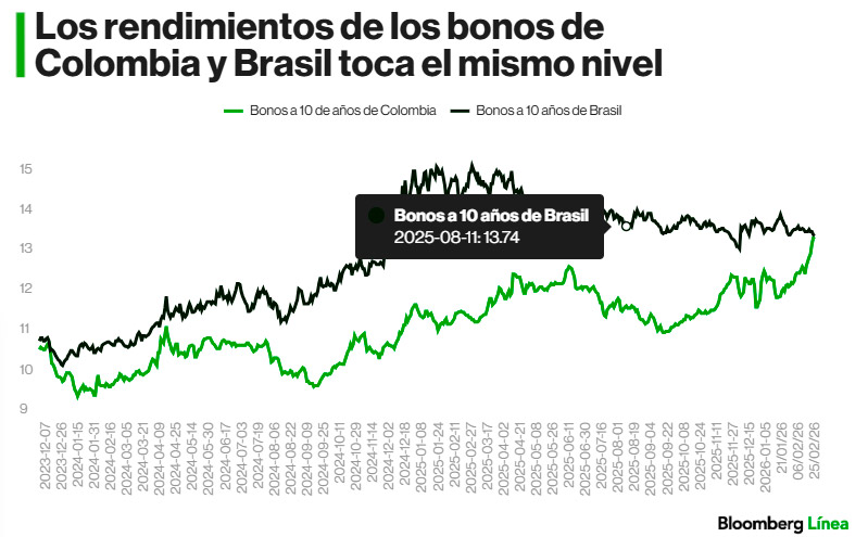 El mercado muestra que el rendimiento del bono colombiano a 10 años alcanza 13,49%, mientras el brasileño se sitúa en 13,51%. La brecha se ha cerrado hasta prácticamente desaparecer. Esta paridad no responde a una caída estructural del riesgo brasileño sino a un ajuste al alza en la prima exigida a Colombia.