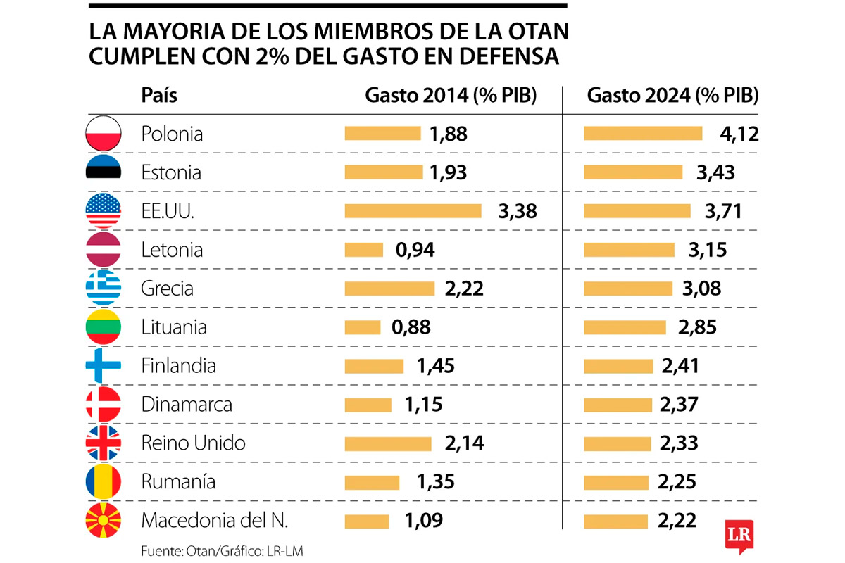 El país de la Otan que más destina a defensa es Polonia, con un gasto de 4,12% de su PIB; la nación es la que se encuentra más cerca de las exigencias de Estados Unidos con el aumento del gasto. En otras cifras: el PIB de Polonia se cuenta en US$809.200 millones; 5% de este monto es US$40.460, lo destinado, aproximadamente, por este miembro de la Otan a la defensa de la coalición.