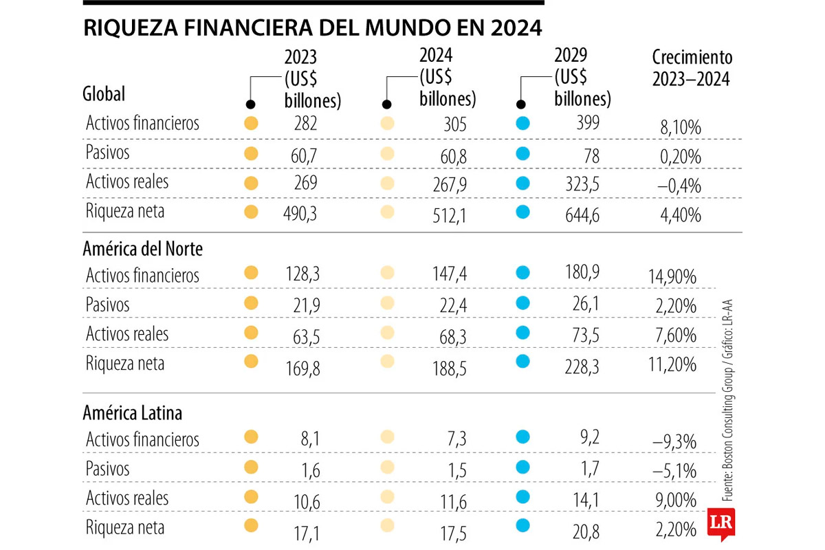 Un informe de Boston Consulting Group, BCG, arrojó que la riqueza global financiera durante el año pasado alcanzó US$305 billones, cifra que tocó un máximo histórico. Este dato representa un aumento de 8% comparado con el año inmediatamente anterior. América del Norte y Asia Pacífico son las regiones de mayor riqueza reportada el año pasado con US$147,6 y US$65,6 billones, respectivamente. América Latina concentró US$7,3 billones. Colombia, por otro lado, tuvo un crecimiento bajo, de apenas 1%, y US$420.000 millones de riqueza en 2024.