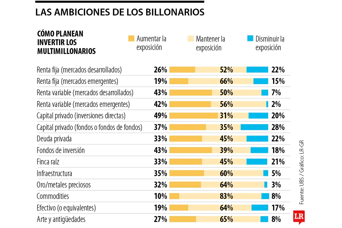 UBS también sugiere que los multimillonarios están reforzando posiciones en activos que funcionan como cobertura frente a incertidumbre global. La infraestructura se consolida como una apuesta relevante, con 35% de los encuestados aumentando exposición, mientras 32% planea incrementar inversión en oro y metales preciosos. Este movimiento refleja una preferencia por activos reales que puedan proteger valor en escenarios de inflación intermitente, roces geopolíticos y cambios abruptos en la política económica.