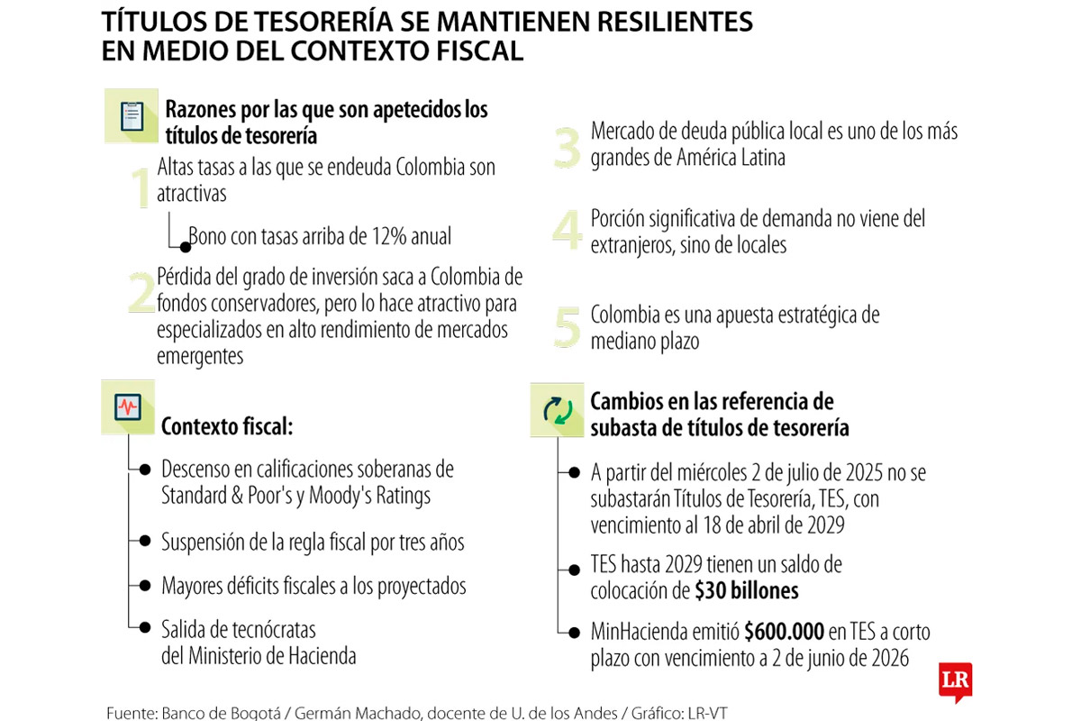 Pero hay otros elementos que explican por qué los inversionistas siguen apostando por los TES, a pesar de que el país ha registrado déficits fiscales superiores a los proyectados, ha recibido rebajas en su calificación crediticia, suspendió la regla fiscal por tres años y ha enfrentado la salida de varios tecnócratas del Ministerio de Hacienda, esto último según lo indicó el Banco de Bogotá.