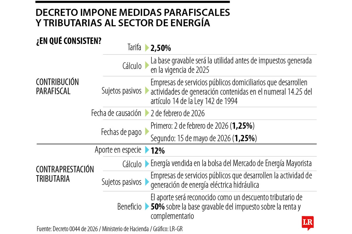 Con el Decreto 0044 de 2026, enmarcado en la emergencia económica, también fijó una nueva contraprestación tributaria de 12% a energía vendida en mercado mayorista