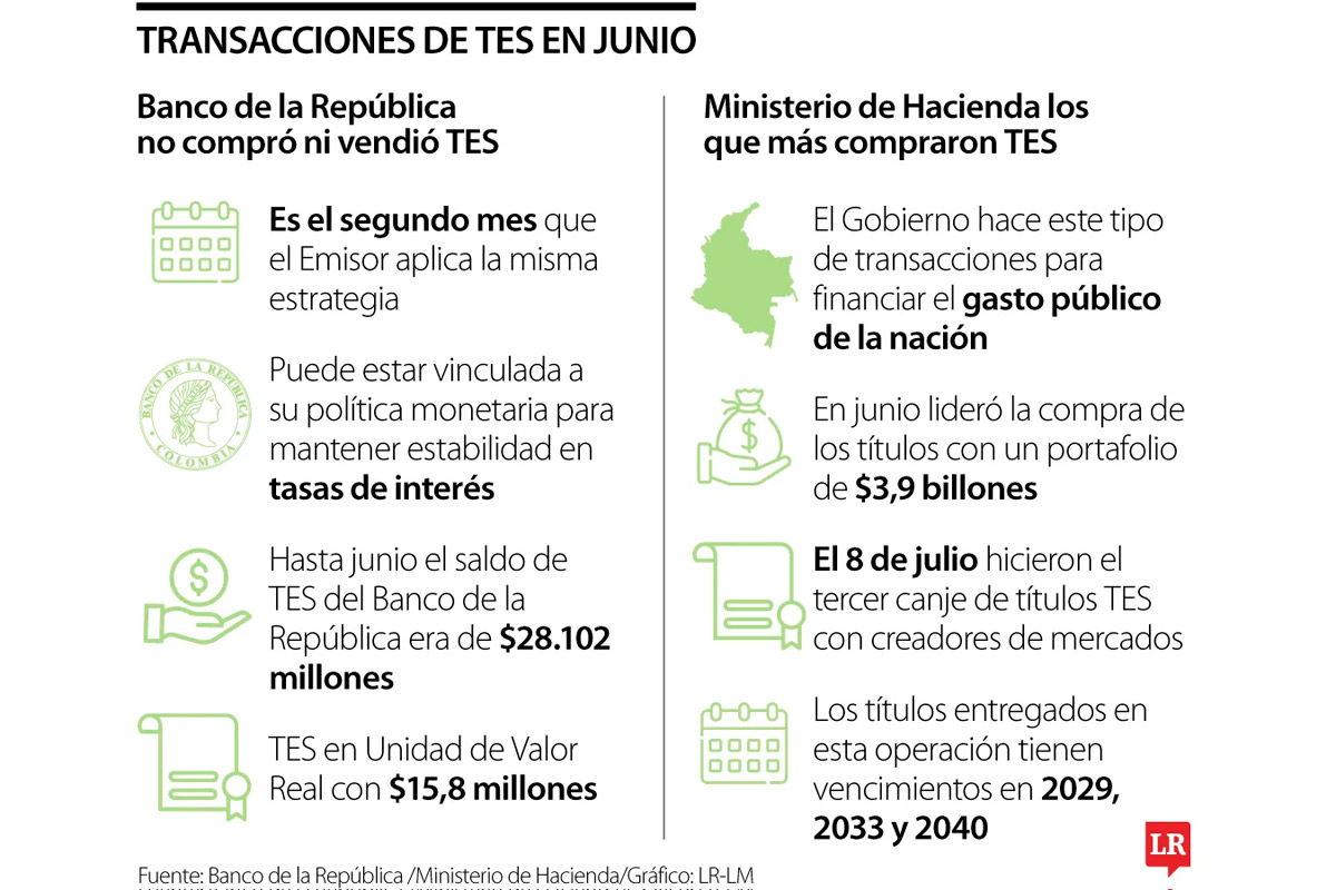 Mientras el Banco de la República ha decidido estos meses en no comprar ni vender títulos TES B, vinculado a sus decisiones en el marco de su política monetaria, el Ministerio de Hacienda es la entidad pública que a junio lidera la de compra de estos títulos de deuda pública con un portafolio de $3,9 billones al cierre del primer semestre. El Gobierno está centrándose en estas operaciones para financiar el gasto público de la nación.