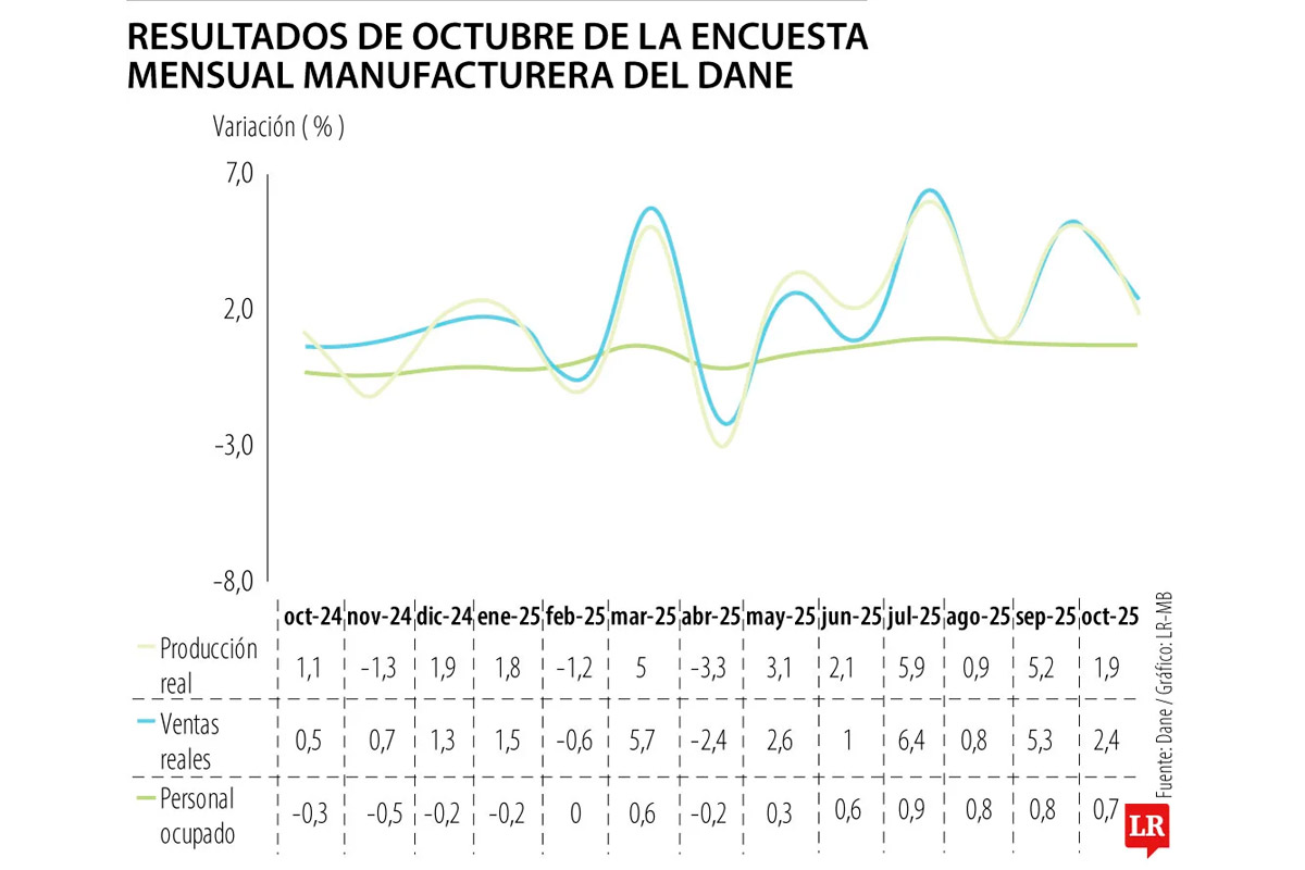 📊 Según la Encuesta Mensual Manufacturera con Enfoque Territorial (#EMMET), en octubre de 2025 frente a octubre de 2024, la producción real de la industria manufacturera presentó una variación de 1,9%, las ventas reales de 2,4% y el personal ocupado de 0,7%. pic.twitter.com/6D6faKvFje