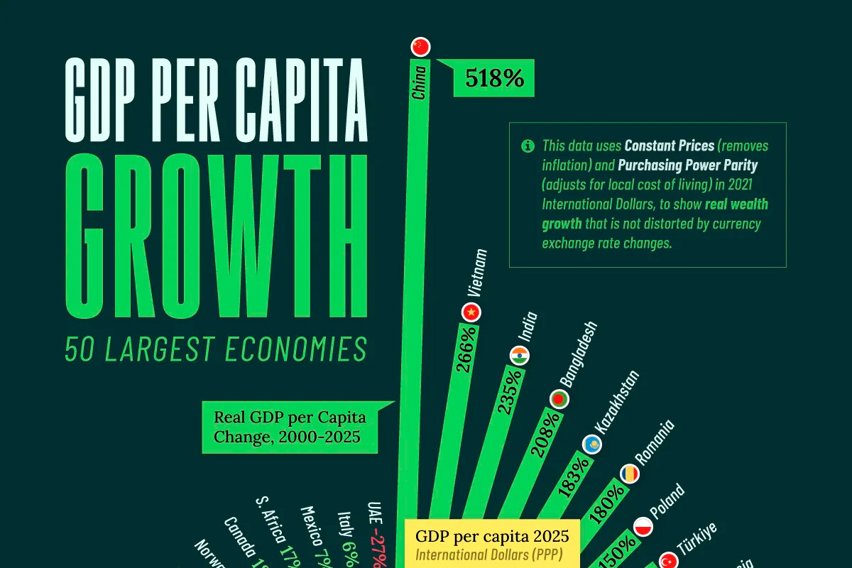This visualization ranks the top 50 economies in GDP terms by real GDP per capita growth since 2000 using data from the International Monetary Fund, and shows where living standards have improved the most.